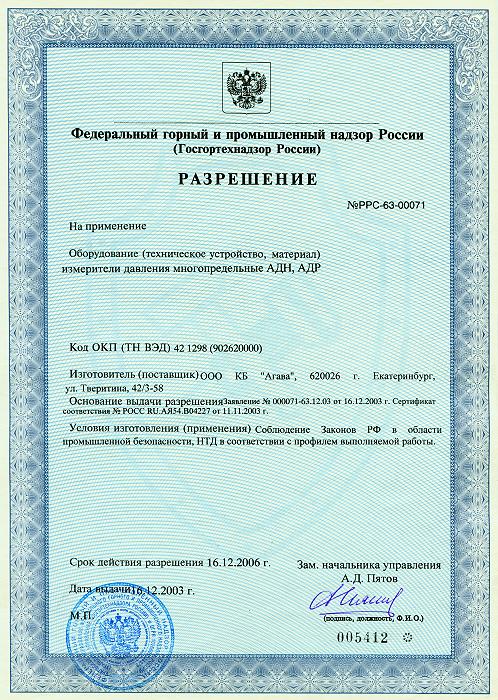 Разрешение Госгортехнадзора России на выпуск и применение