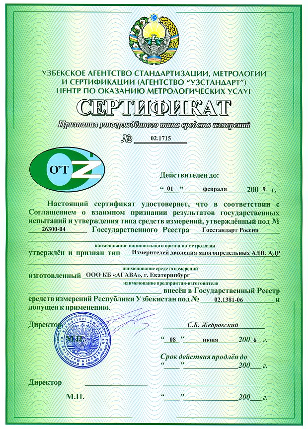 Сертификат об утверждении типа средств измерения (Узбекистан)